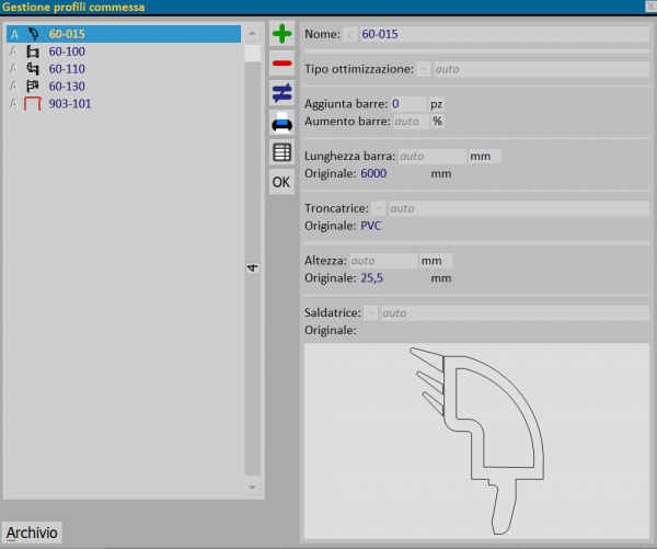 In questo quadro vengono inseriti tutti i profili della commessa ed è possibile, per ognuno, modificarne la quantità la lunghezza, il tipo di ottimizzazione o il macchinario abbinato, senza cambiare i dati in archivio.